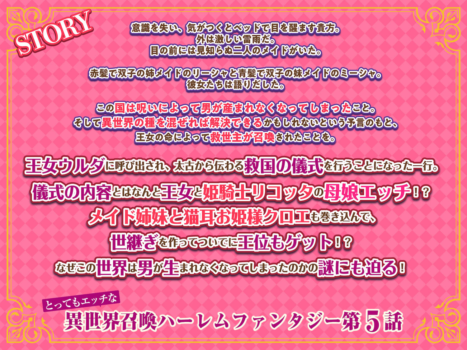 王女と姫騎士をパーティーで籠絡して世継ぎを作って亡国を救うためにハーレムエッチ 〜男が産まれない異世界へ召喚された俺がヒロインを充てがわれて子作りエッチ5〜 あらすじ