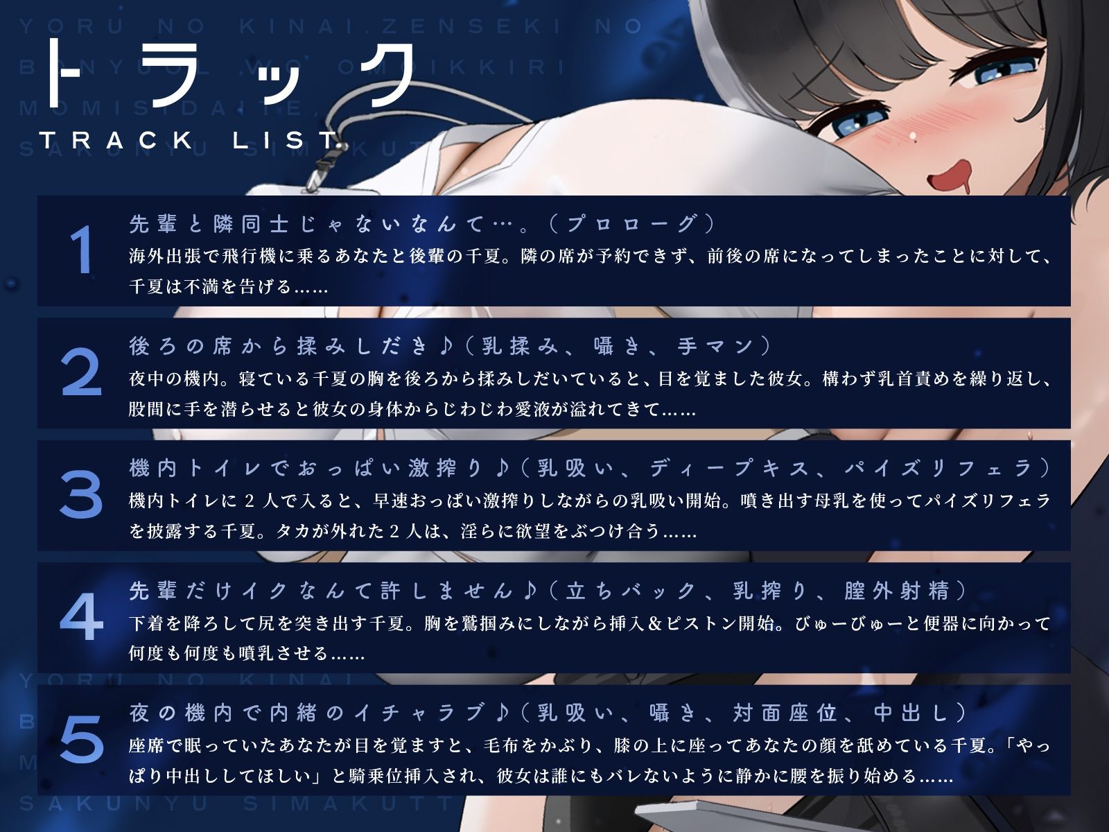 夜の機内。前席の母乳OLを思いっきり揉みしだいて、搾乳しまくってやった♪(KU100マイク収録作品) あらすじ
